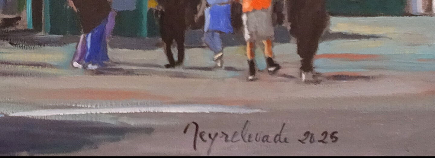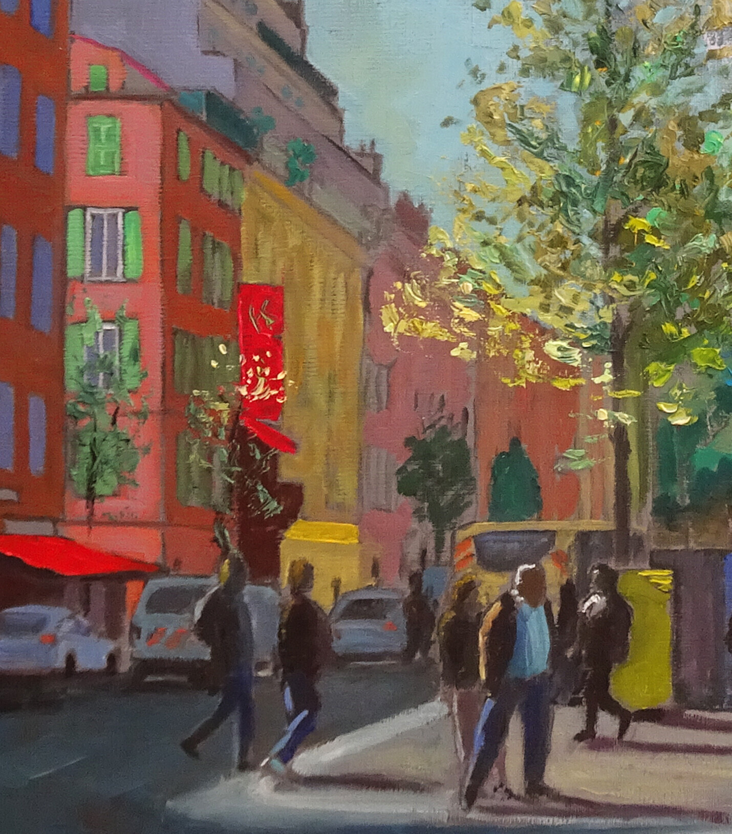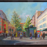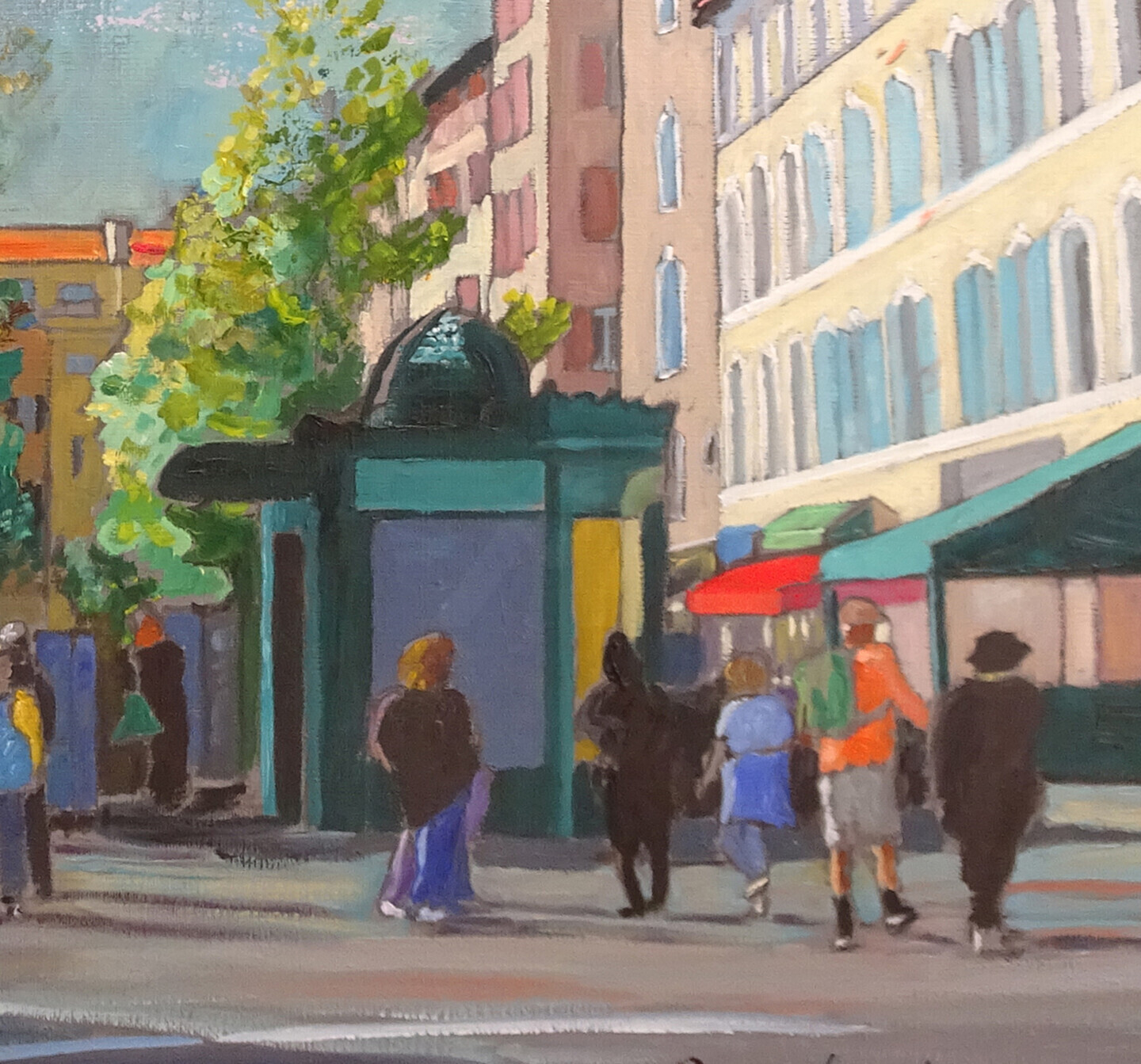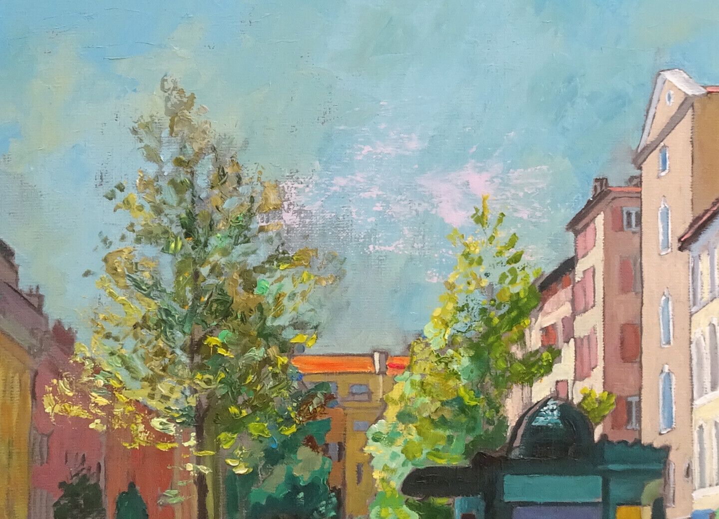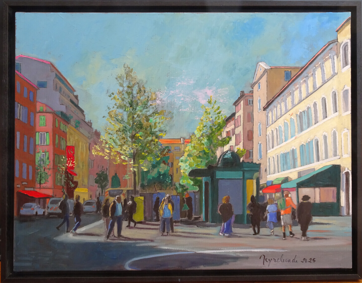 Sous la lumière douce et vibrante du Midi, le Cours Jean Ballard s’étire comme une veine tranquille au cœur de Marseille. Mon tableau à l’huile capture cette atmosphère méditerranéenne : des promeneurs flânent devant un kiosque à journaux, les terrasses de restaurants s’ouvrent à la conversation, et le temps semble suspendu dans une paix fragile. Pourtant, derrière cette scène sereine, une tension sourde affleure — celle des nouvelles imprimées, des titres qui racontent les ambitions belliqueuses des puissants, les fractures du monde.