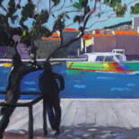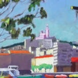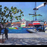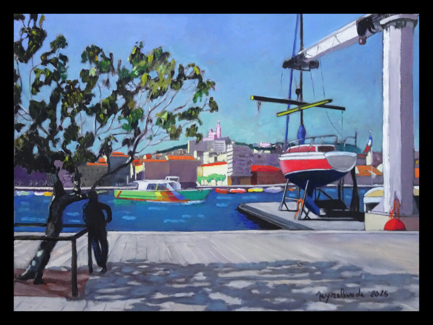 Cette huile rend hommage à un figuier bien réel, enraciné sur le Vieux-Port de Marseille, témoin silencieux des jours qui passent et des vents qui tournent. À ses pieds, un voilier repose en cale sèche, suspendu entre mer et ciel, tandis qu’au loin veille Notre-Dame de la Garde, comme l'espèrent les habitants de la ville, gardienne des âmes et des marins.